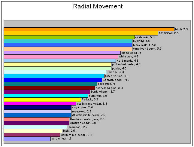 Below are some charts showing the movement rates for some common wood species. for more information about movement do a web search and you can find information on this topic.
